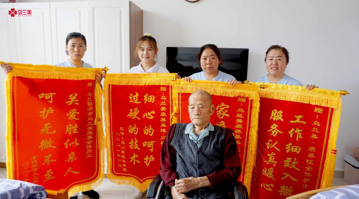 原來,李爺爺家屬口中的護(hù)士和護(hù)理人員們都在烏蘭美康養(yǎng)院工作,她們用過硬的專業(yè)知識和嫻熟的照護(hù)技能,對入院的長者進(jìn)行專業(yè)護(hù)理,用細(xì)心、耐心、愛心、責(zé)任心陪伴左右,不怕苦、不怕累,盡職盡責(zé)的為長者緩解消除恐懼、焦慮和陌生感,減輕身心痛苦。她們待長者如親人的用心照料,讓李爺爺家屬十分感動(dòng),所以連送四面錦旗,以表誠摯的感謝。